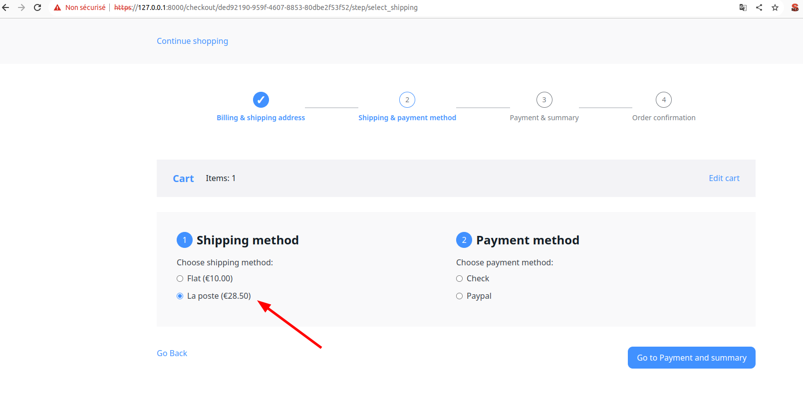 Le reste du tunnel d'achat est fonctionnel et orienté entreprise. Lors du premier test, je n'étais pas connecté et la commande a été passée sans ouvrir de compte sur le site. Cette fonctionnalité est similaire à Sylius et m'étonne pour un e-commerce à destination d'entreprise. L'obligation d'ouvrir un compte me semble plus nécessaire tout comme la saisie du numéro de TVA Intracommunautaire.