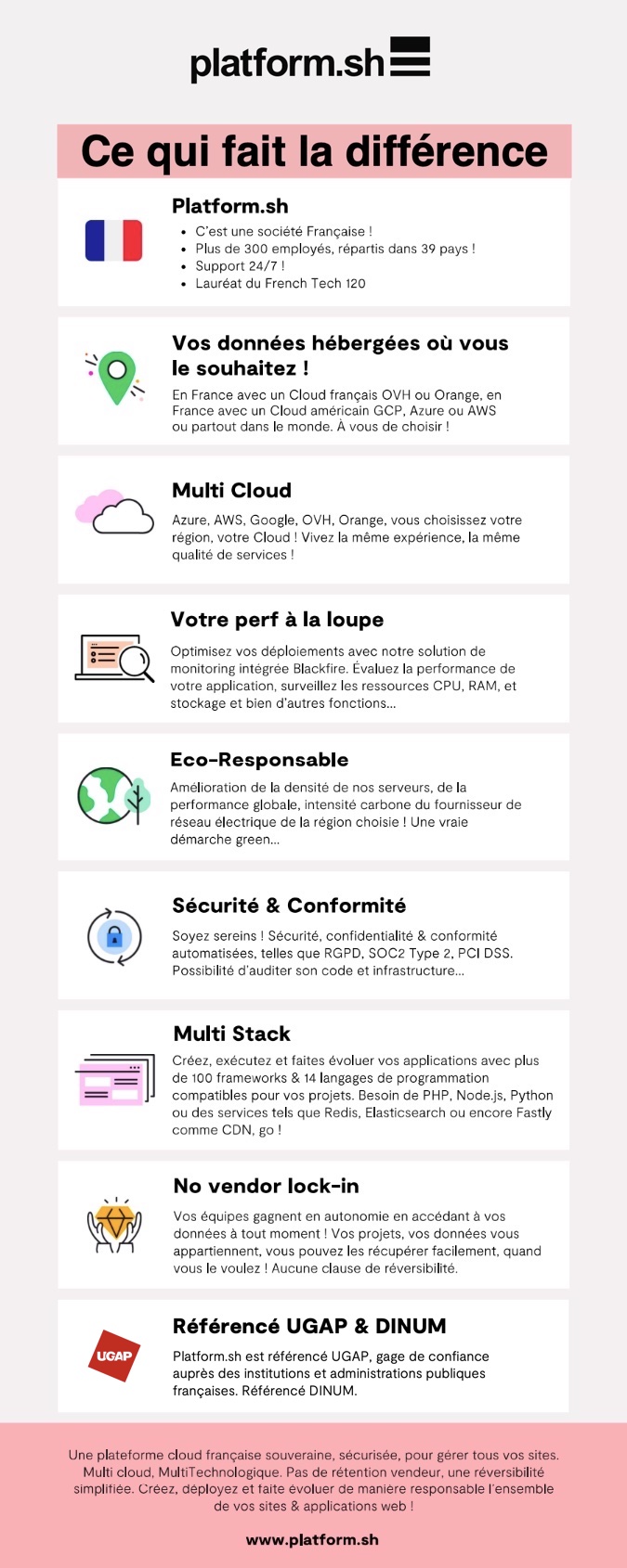 Code Rhapsodie est partenaire de Platform.sh depuis plusieurs années maintenant et nous ne préconisons pas cette solution par hasard. Voici les 9 points clefs qui font la différence :